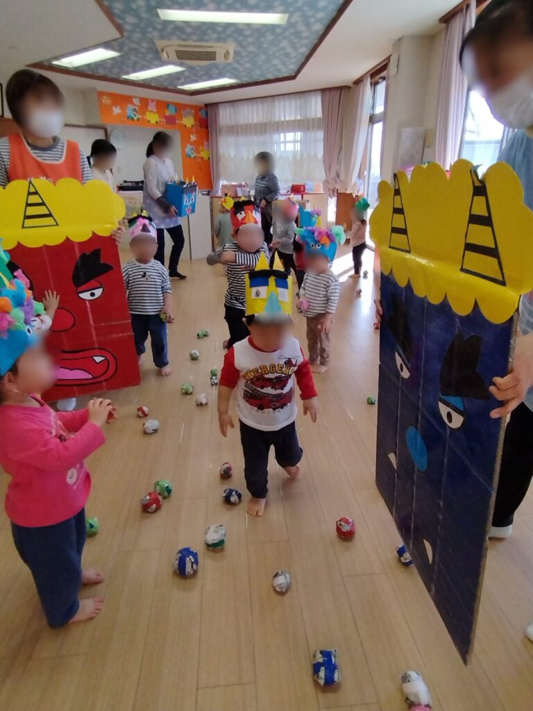 鬼の絵や箱に向かって新聞紙のボールを投げて鬼退治‼